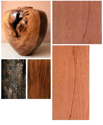 Color albura: blanco rosa. Color duramen: varía del pardo rosa cobrizo al pardo rojo.