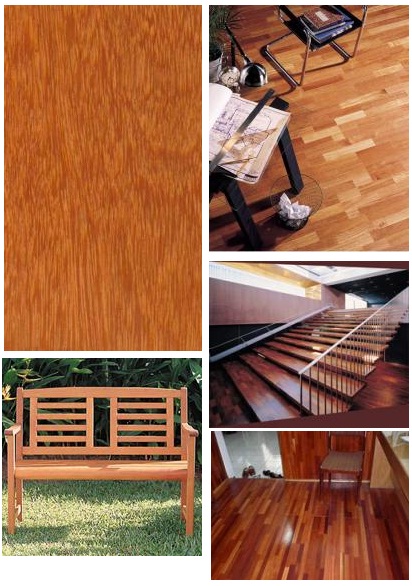 Color albura: varía del amarillo claro al blanco. Color duramen: varía del rosa oscuro al rojo anaranjado claro o al marrón oscuro. Presenta numerosas vetas amarillentas |