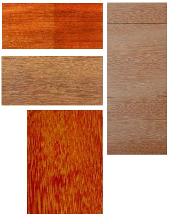 Color albura blanco grisáceo. Color duramen varía de pardo rosa al pardo rojo. Albura diferenciada. En cortes tangenciales figuras parabólicas originadas por la diferencia de intensidades de color en los anillos de crecimiento. |